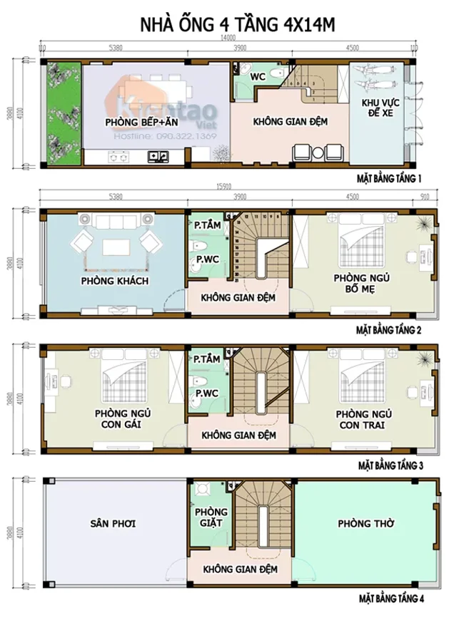 Или вот ещё один проект — четырехэтажный дом шириной около 4 метров. На первом этаже тут гараж для мопедов, потом — прихожая, из которой лестница наверх, за прихожей — кухня-столовая. На втором этаже находятся спальня и гостиная, на третьем — ещё две спальни, на четвёртом — всякие вспомогательные помещения. Кажется, теперь понятно, почему многие вьетнамцы такие худые: им постоянно приходится бегать по лестницам вверх и вниз даже в собственном доме.