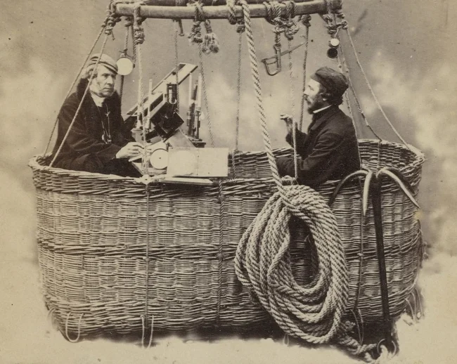 Джеймс Глейшер (слева) и Генри Трейси Коксвелл совершают полёт на воздушном шаре в 1864 году