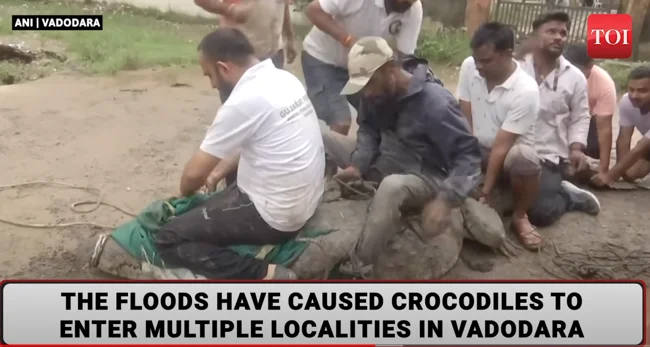 Крокодилы приплыли в Вадодару из-за после разлива местной реки, вызванного рекордным количеством осадков. Сначала местные жители едва не потеряли все, что имеют, из-за наводнения. Нельзя было ходить по улицам, пришлось спасать имущество. И вдобавок ко всему – крокодилы, причем – голодные и опасные.