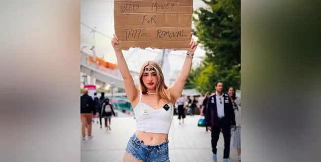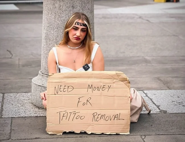 Сторонница Дональда Трампа, которая привлекла внимание СМИ и соцсетей из-за своей радикальной татуировки, теперь просит у прохожих в Лондоне о финансовой помощи.