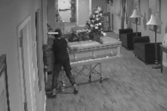 Инцидент произошел поздно ночью, когда прохожий обратил внимание на лежащего возле похоронного бюро человека без признаков жизни и стоящий рядом гроб. Вызванная полиция просмотрела записи с камер видеонаблюдения и установила, что неизвестная женщина разбила окно входной двери похоронного бюро, проникла внутрь и вынесла гроб.