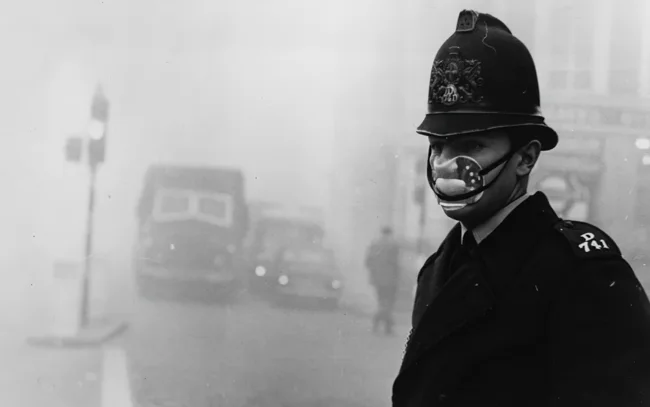 14. Полицейский в защитной маске во время смога в Лондоне, 1952 год