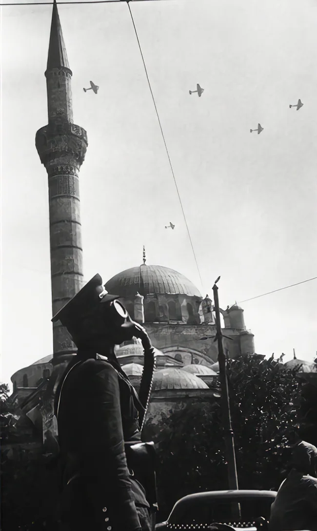 1. Турецкий офицер в противогазе во время воздушной тренировки. Вторая мировая война, Стамбул, Турция, 1939 год