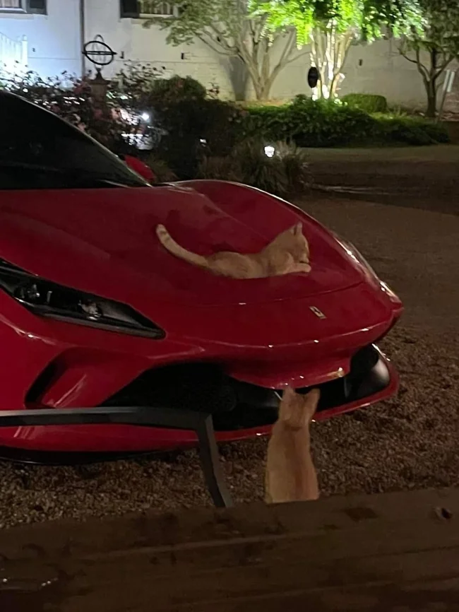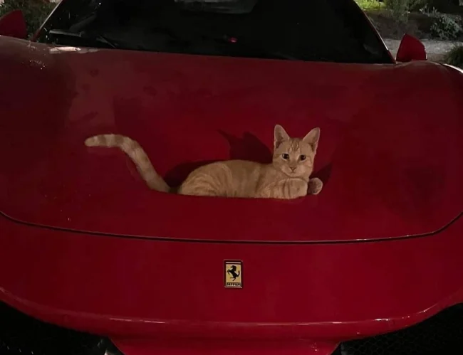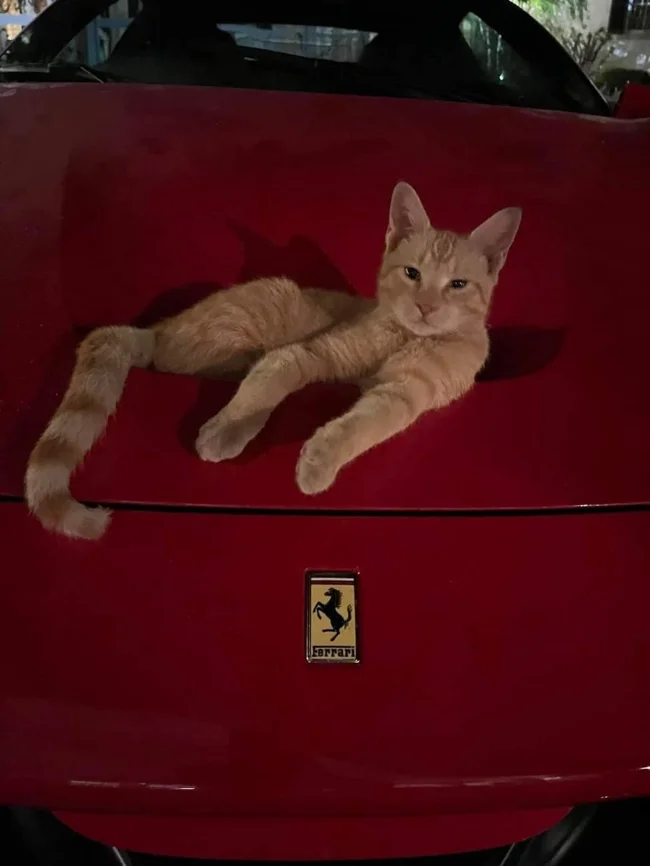 На этих фото мы видим блестящую Ferrari. Но внимание захватывает не машина, а ее неожиданный пассажир — пушистый кот, уютно устроившийся в выемке капота. Кот, словно король, растянулся, демонстрируя свою беззаботность.