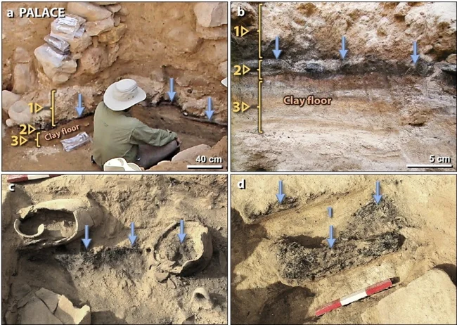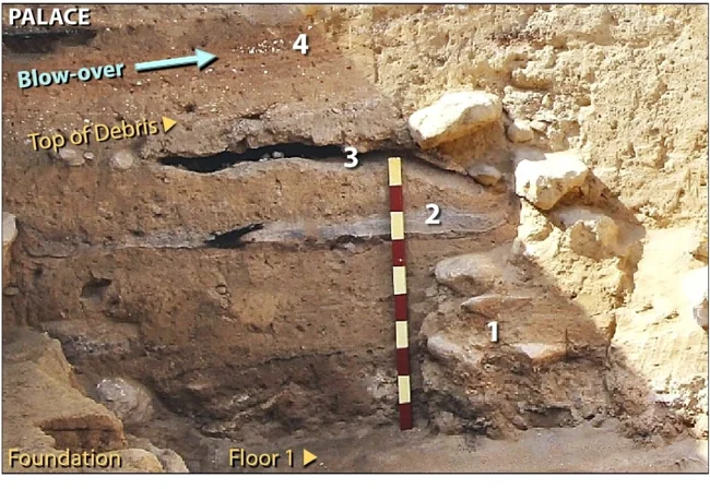 Раскопки главного дворца — виден ясно выраженный обугленный слой