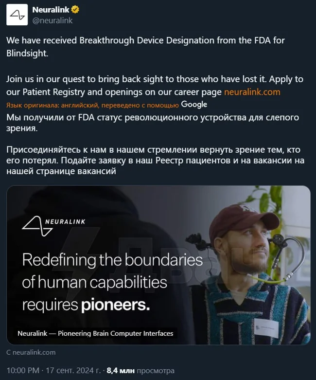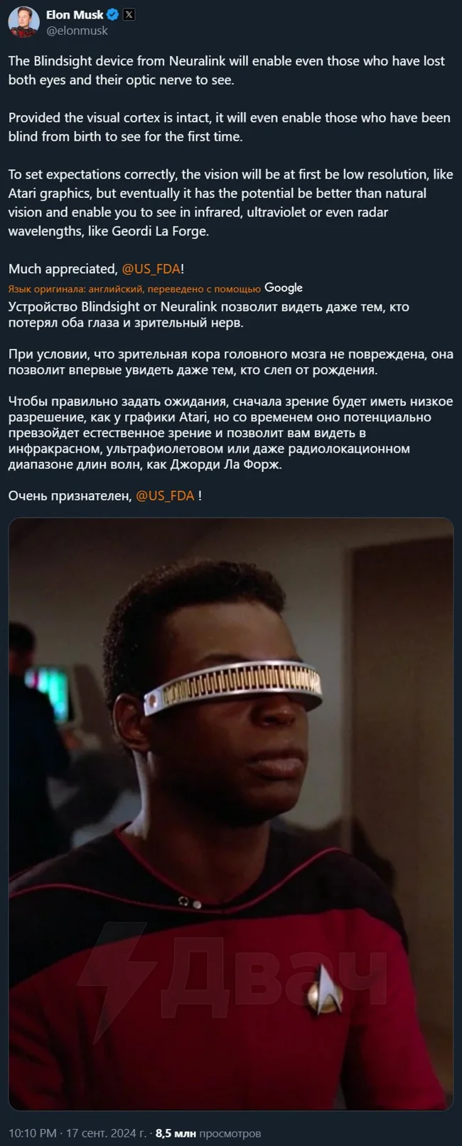 Илон Маск с радостью объявил, что его устройство Blindsight получило одобрение от Управления по контролю за продуктами и лекарствами (FDA), что делает его поистине революционным. Хотя в первое время зрение у людей с таким имплантом будет не очень хорошим, в перспективе оно может превзойти естественное и даже дать возможность видеть в инфракрасном, ультрафиолетовом и даже радиолокационном диапазонах.
