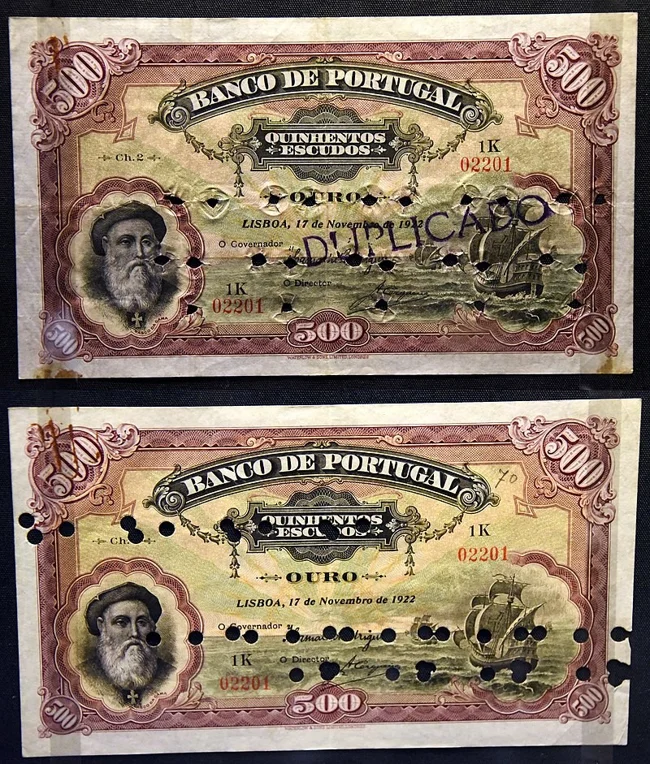 Поддельная банкнота в 500 эскудо (верхняя) и подлинная банкнота (нижняя) Банка Португалии. Обе имеют одинаковый серийный номер 1K 02201, 1922. Выставлены в Британском музее в Лондоне.