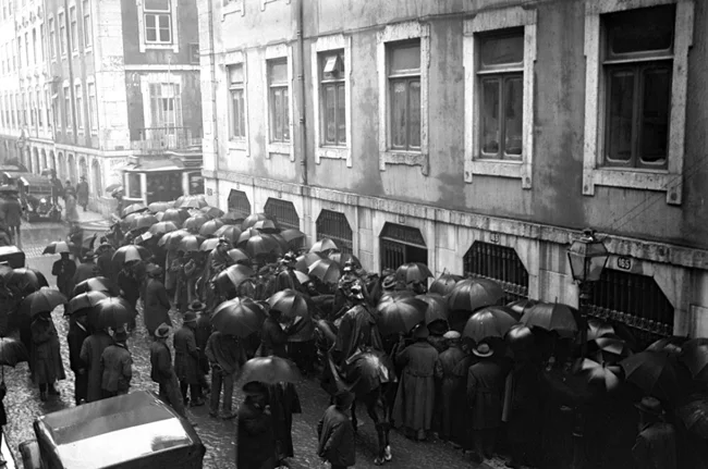 Толпы людей устремляются к зданию Банка Португалии в Лиссабоне, чтобы обменять фальшивые банкноты (8 декабря 1925 г.)
