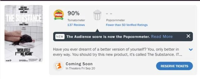 Если вы давно искали ужастик, который бы смог вас растормошить, то ваше желание исполнено. Встречайте, "Субстанция" - самый страшный и мерзкий бодихоррор 2024 года. Фильму дали 90% свежести на Rotten Tomatoes. По сюжету пожилая голливудская звезда хочет вернуть молодость с помощью экспериментального препарата, после чего начинается лютая жесть с кровью и кишками. Говорят, что журналистов и критиков буквально тошнило в кинотеатрах от трешанины на экране, но они остались довольны!