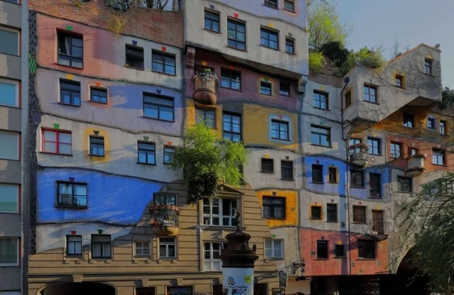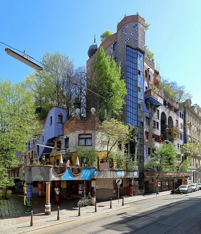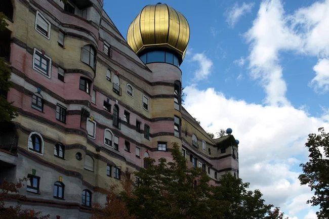 Его создатель - австрийский художник и архитектор-новатор Фриденсрайх Хундертвассер. Крыша выполнена с использованием маковок синего и золотистого цветов, а ещё на ней есть настоящий сад.