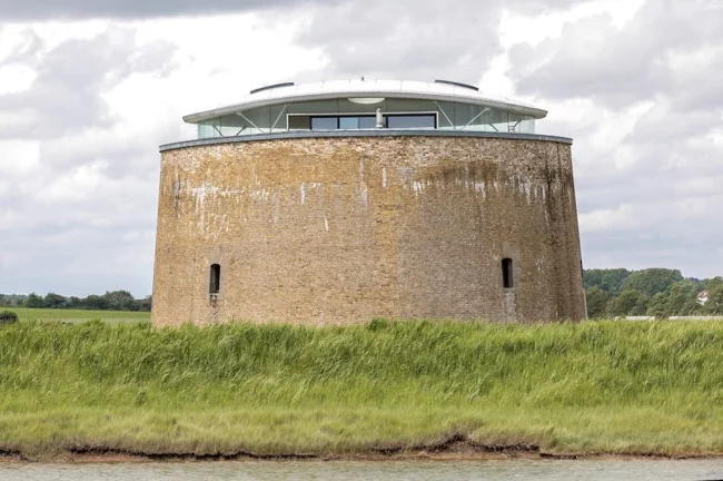 Этот дом на тихом участке побережья в Саффолке - башня Мартелло начала XIX века, построенный на месте старого форта, был продуман совместно с организациями по сохранению наследия. Куполообразная крыша с зонтиками, освещенная ночью, напоминает летающую тарелку, поднимающуюся из тумана.