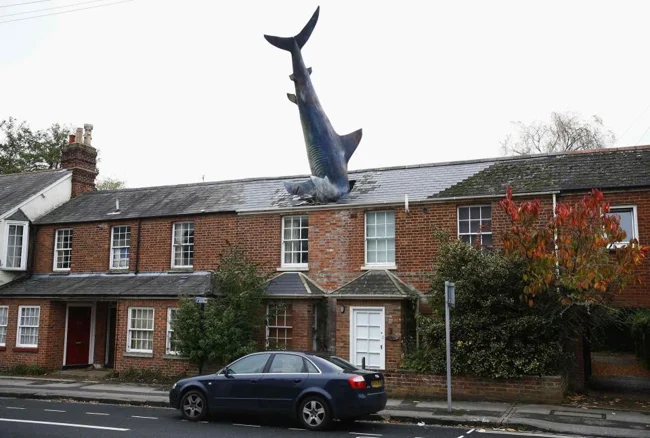 Крышная скульптура на крыше здания по адресу Нью-Хай-стрит, дом 2, Хедингтон, Оксфорд, Британия. Выполнена в виде большой акулы, «встроенной» головой вперёд в крышу дома.