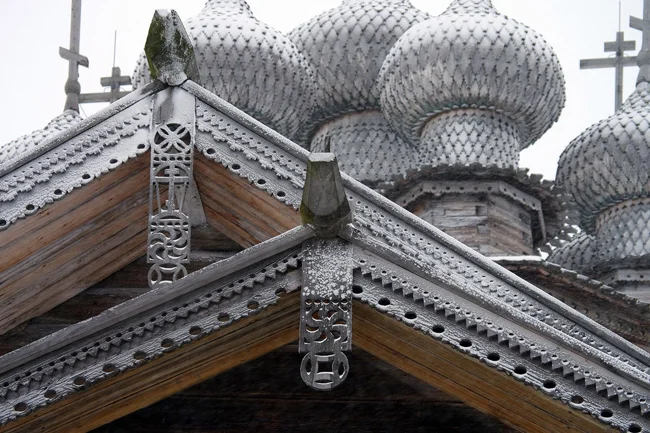 Здание полностью деревянное, а серебристые купола являются единственным элементом, собранным с помощью гвоздей. Легенда гласит, что его создатель - мастер по имени Нестор использовал один топор. А когда закончил работу, выбросил инструмент в озеро со словами, что второго такого не было и больше не будет.