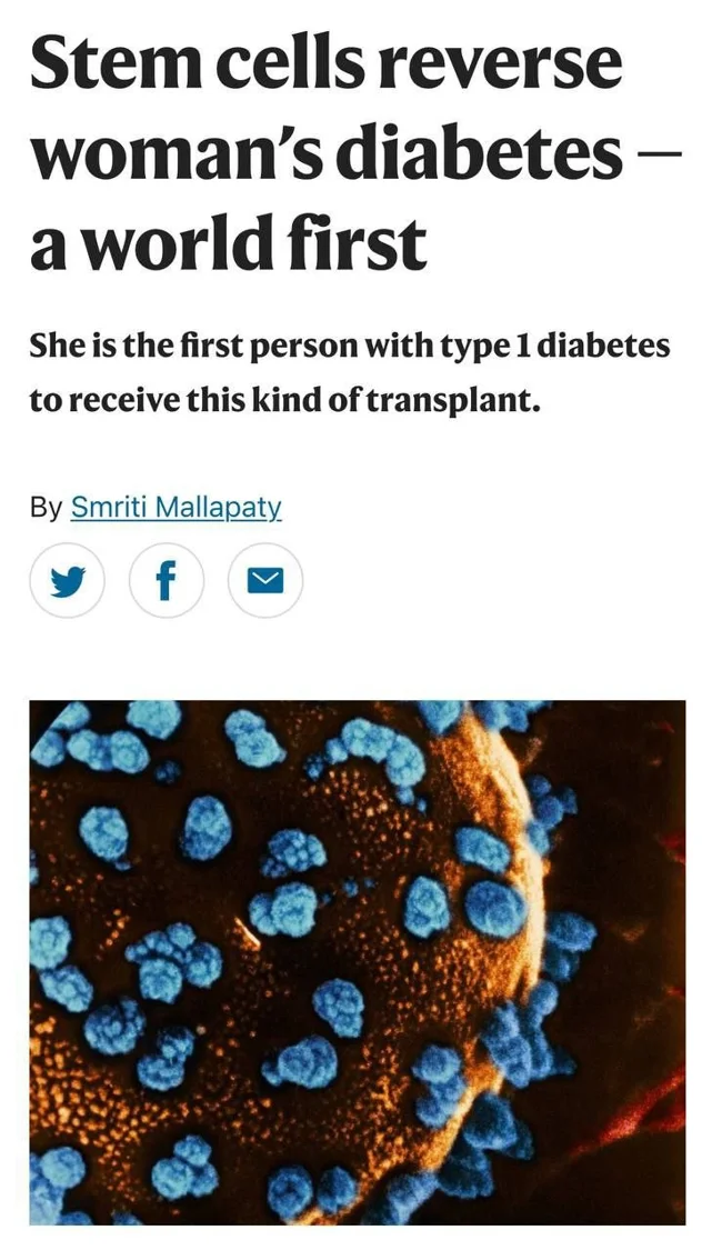 Год назад в Китае была проведена экспериментальная операция, в ходе которой 25-летней женщине с диабетом 1 типа сделали трансплантацию стволовых клеток. Буквально через 75 дней её организм начал самостоятельно вырабатывать инсулин. В настоящее время ее состояние остается стабильным. Сейчас ученые наблюдают еще за двумя женщинами, перенесшими аналогичные операции. Пока их состояние с каждым днем улучшается.