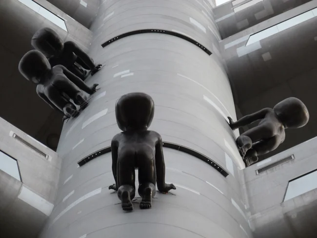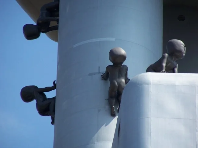 Жуткими фигурами без лица зачем-то решили украсить телебашню Праги. Безликие младенцы – творение местного автора Давида Чёрны. Интереснее башня не стала, а вот желание перекреститься у прохожих странные существа, застывшие на ней, вызывают.