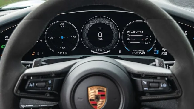 При этом паспортные данные выглядят несколько скромнее: 2.1 секунды с 0 до 60 миль в час, и то с опциональным пакетом Weissach, подразумевающим облегчённую массу авто. Напомним, у Taycan Turbo GT при активации лаунч-контроля отдача двухмоторной установки мгновенно взлетает с 789 до 1033 л. с., а кратковременно, в режиме Attack Mode, и вовсе до 1109 л. с.