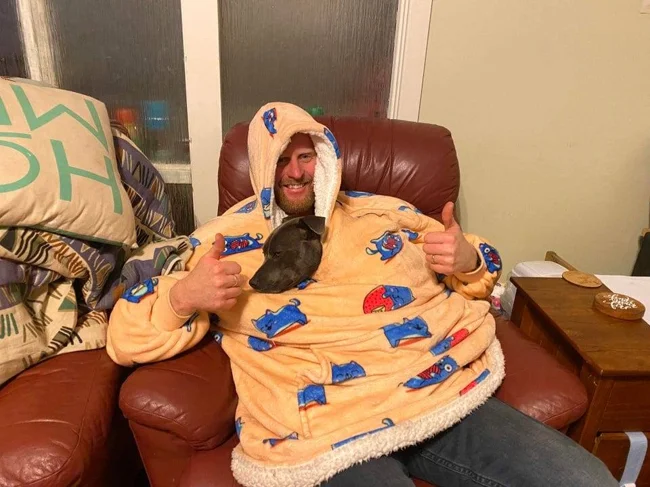 Мне подарили толстовку, и мой пёс уверен, что её надо носить вот так