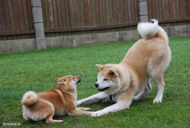 Не буду я с тобой играть, уголовник (слева — взрослая сиба-ину; справа — взрослая акита-ину)!