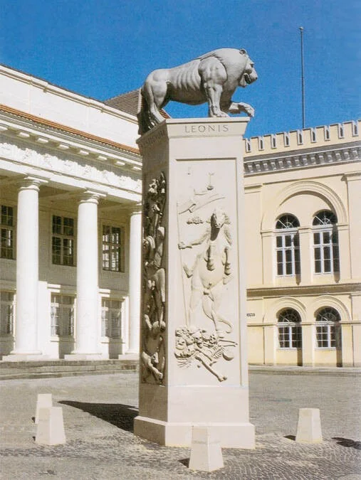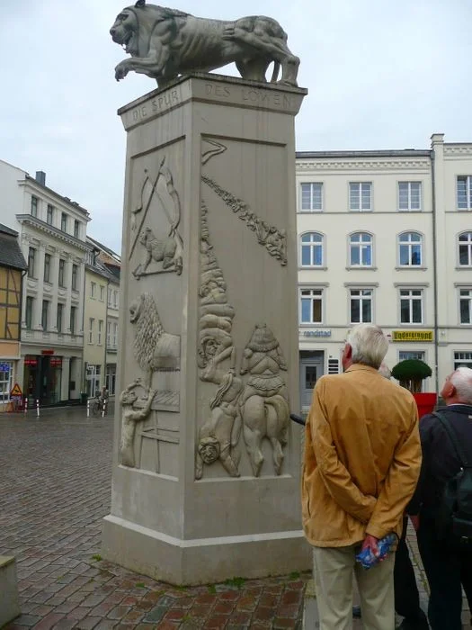 Художник Петер Ленк известен своими провокационными и ироничными работами. Своим памятником в Шверине он хотел показать многогранность Генриха - основателя и разрушителя города, гордого правителя и апокалиптического всадника. Живописные рельефы завоевания Мекленбурга изображены в военном и нелицеприятном ключе. Показ, резня, прославление - с таким взглядом на историю художник сталкивает зрителей памятника. В своем памятнике Льву Ленк также спрятал секрет.