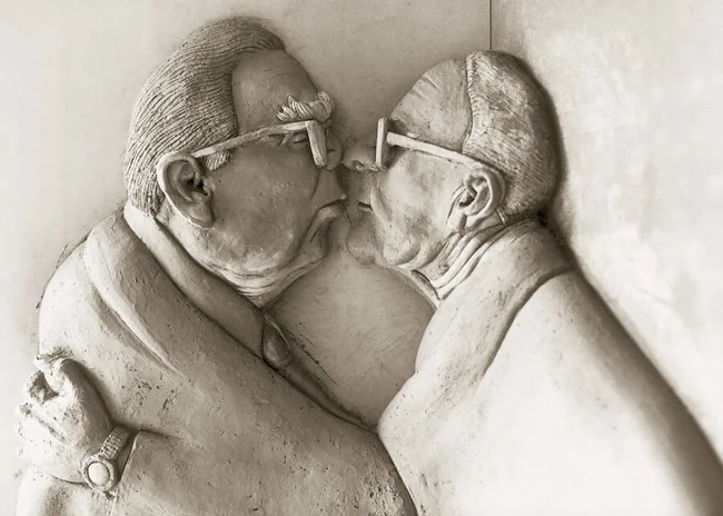 Через отверстие в задних конечностях гордого коня Генриха можно было бы заглянуть внутрь - если бы оно не было запечатано. Внутри Ленк изобразил на рельефе государственного и партийного лидера Восточной Германии Эриха Хонеккера и его советского коллегу Леонида Брежнева в братском поцелуе. Однако художник отвергает свободный взгляд на братский поцелуй. Он лишь хотел сохранить память об истории ГДР.