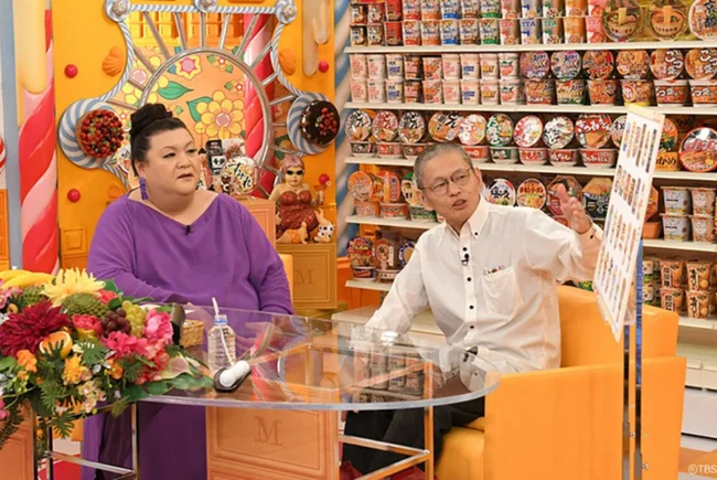 Ведущая на тв изучает доску, на которую Ояма наклеил свои "фантики" от лапши