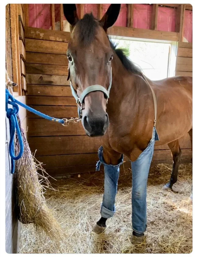14. "Коню моей жены досаждали мухи, которые беспокоили его рану на ноге, поэтому она смастерила для него джинсы на подтяжках"