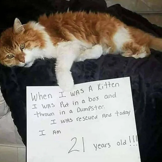 2. "Когда я был котенком, меня положили в коробку и выбросили на помойку. Меня спасли, и сегодня мне 21 год!"