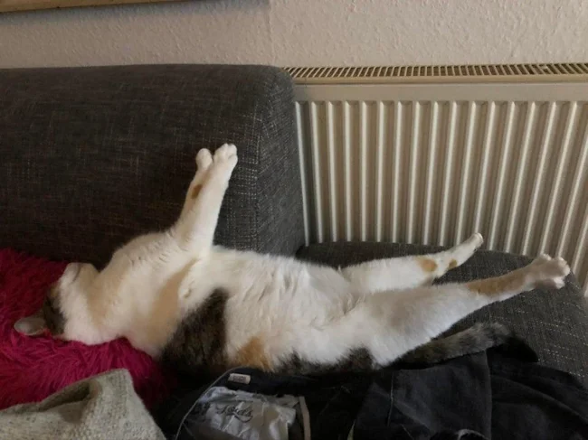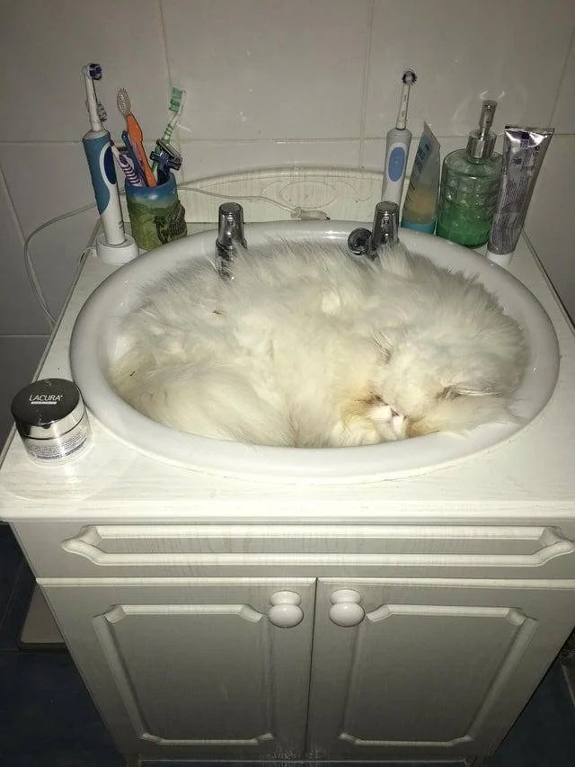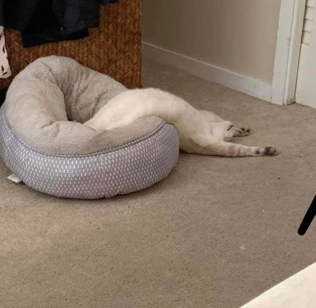Коты — это жидкость, давно известно, так что мало того, что спать они могут в любой позе, так ещё и в любом месте, занимая всё пространство. И выглядит это всё чрезвычайно забавно.