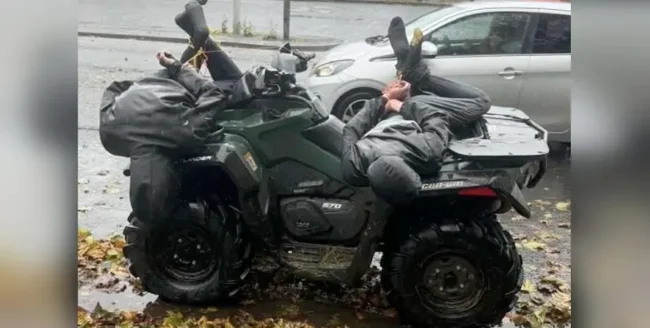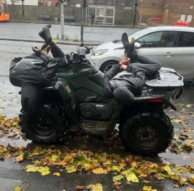 В полиции Ланкашира сообщили, что в 11:26 утра в воскресенье 20 октября к ним позвонил из своего дома в Траудене мужчина, который сказал, что задержал двух "нарушителей". Пока полиция направлялась на вызов, поступил второй звонок от мужчины, который сообщил, что он сейчас находится в участке Колна с двумя задержанными. Когда правоохранители вышли навстречу, они увидели подростка и 20-летнего юношу, которые висели на квадроцикле со связанными руками и ногами.
