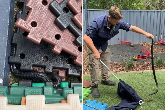 Сотрудники детского сада вызвали профессионального ловца змей, как только заметили опасную рептилию длиной 1,2 метра. Она спряталась на игровой площадке, где часто проводили время дети.