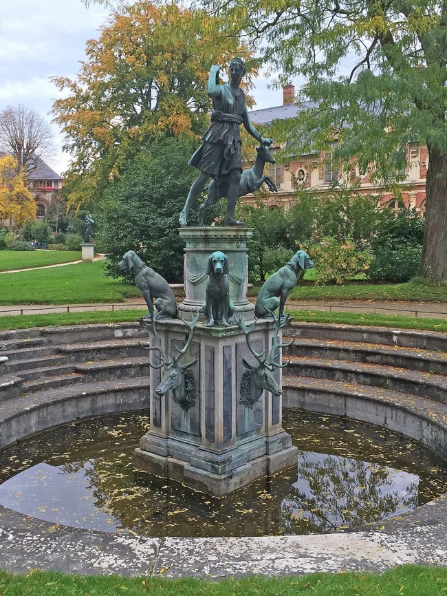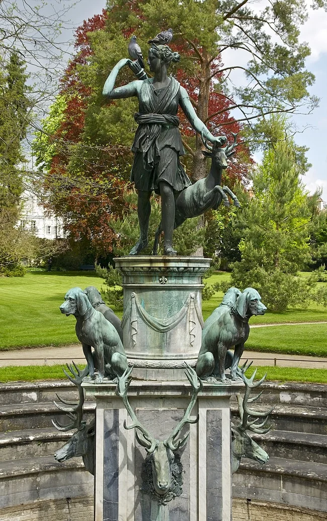 Короли Франции проводили большую часть времени на охоте со своими сворами гончих, поэтому образ Дианы-охотницы встречается повсюду. На этом фонтане, расположенном в садах Фонтенбло, изображены Диана, гордый олень и несколько псов. Собаки выглядят довольно грустными, а может быть, просто измотанными после долгой охоты. Они расположились на своем постаменте и коллективно писают в бассейн.