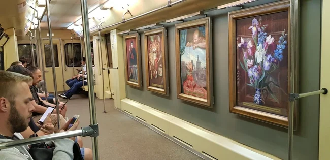 По Арбатско-Покровской линии московского метро курсирует поезд «Акварель» с вагонами, украшенными картинами. Экспозиция постоянно обновляется.