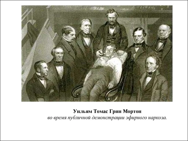 Первая публичная демонстрация эфира в качестве анестезии была проведена в Массачусетской больнице общего профиля в 1846 году бостонским дантистом Уильямом Томасом Грином Мортоном и врачом Джоном Коллинзом Уорреном. Мортон ввёл эфир, после чего Уоррен удалил опухоль с шеи пациента, находящегося без сознания.