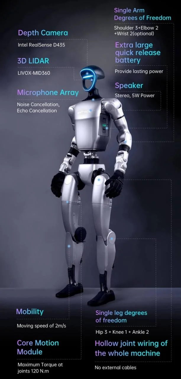Модель носит название Unitree G1. Рост гуманоида 130 см, вес 35 кг, каждая из рук способна поднимать до 2 кг веса, время работы от аккумулятора 2 часа. Сейчас стоит около 16 000 долларов.