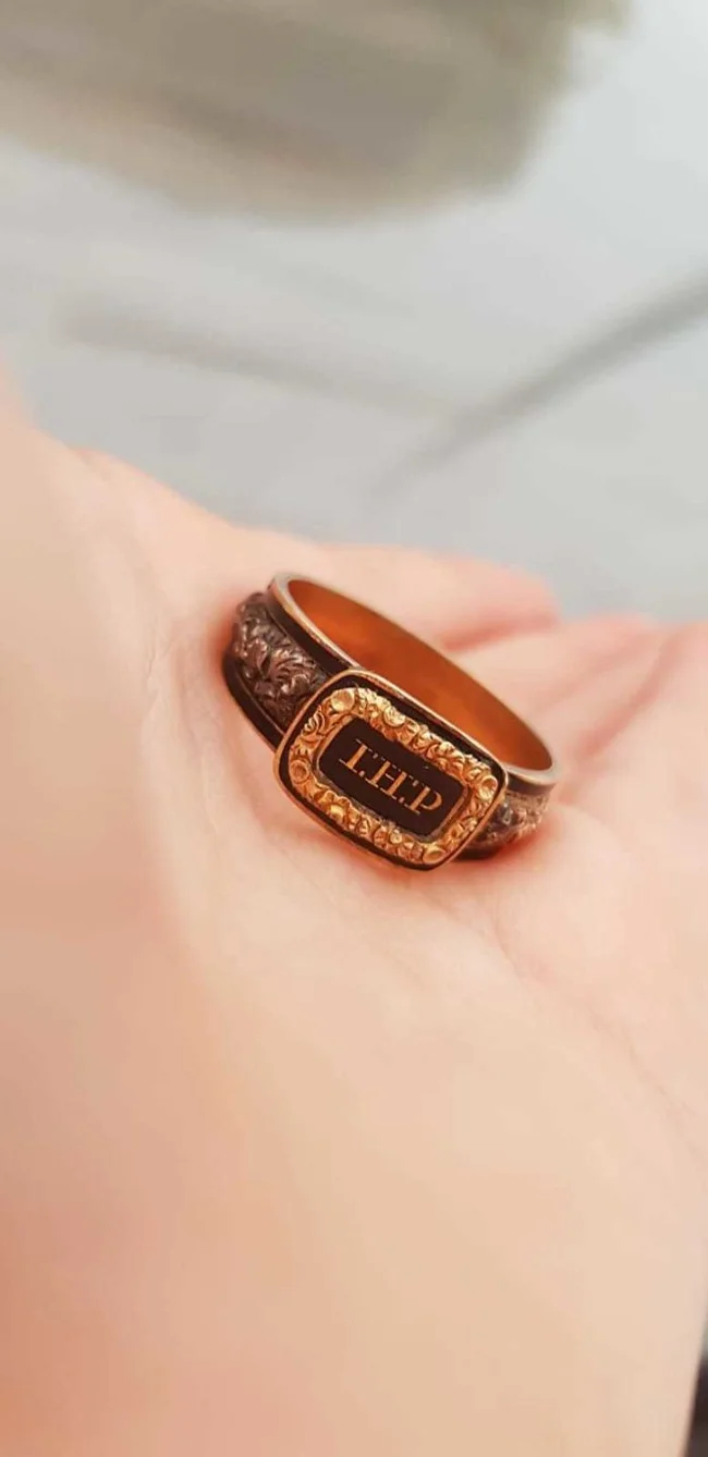 Ответ: "Это траурное кольцо георгианской/ранней викторианской эпохи. Инициалы принадлежат умершему близкому человеку. Обычно их делали из золота (18 карат и выше) и покрывали черной эмалью. Похоже, что твое изготовили примерно в 1820-40-х годах"