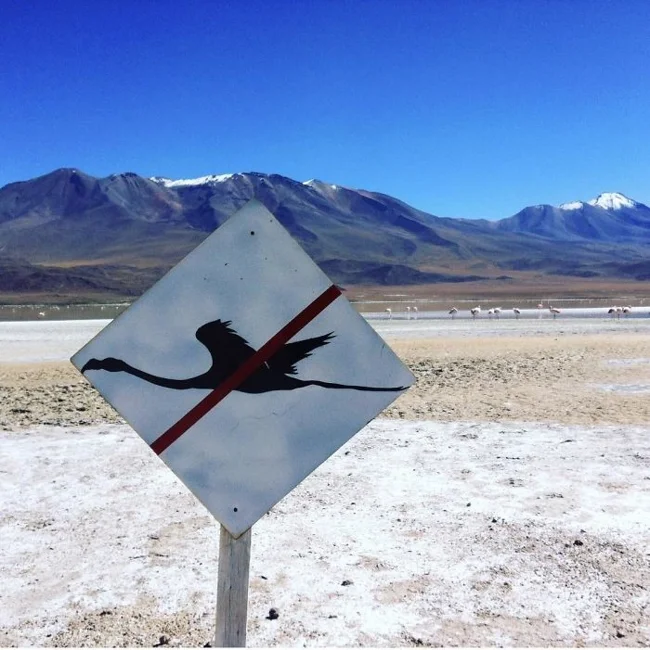 Ответ: "Это значит: "Не пугайте фламинго". Многие игнорируют этот знак и пугают фламинго, чтобы сфотографировать их в полете".