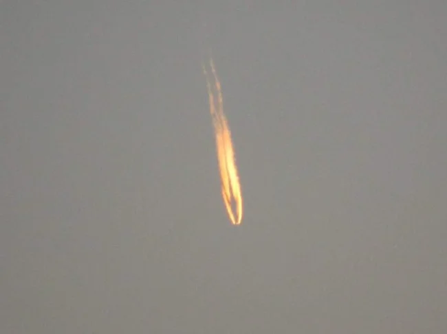 Ответ: "Это след от запуска ракеты, называется "Сумеречный эффект". Фото сделано во время заката, поэтому солнце подсвечивает снизу пар/выхлопной след".