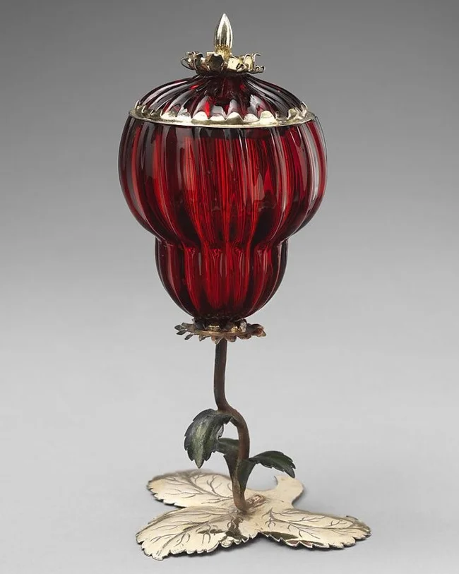 Посуда изготовлена из стекла в конце XVII века. Покрытие бокала из золота считалось противоядием, защищая от отравления тех, кто из него пил. Примечательно, что его красный блеск напоминал фрукт или цветок, что делало его не только своеобразным защитником, но и декоративным элементом на столе.