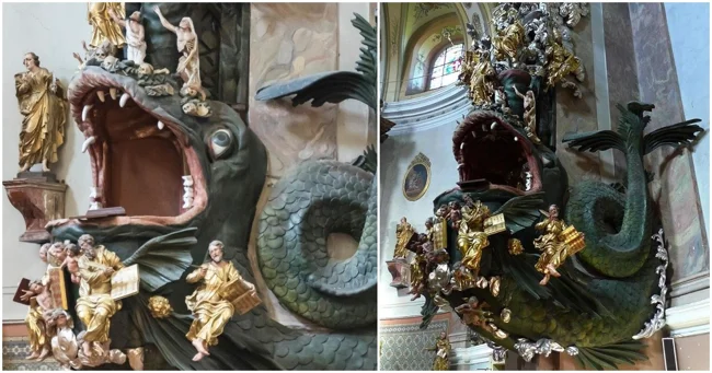 Этот элемент можно увидеть в Нижней Силезии, Польша. Эта кафедра, украшенная барочными элементами, является уникальным образцом церковного искусства, отражая роскошь и величие эпохи.