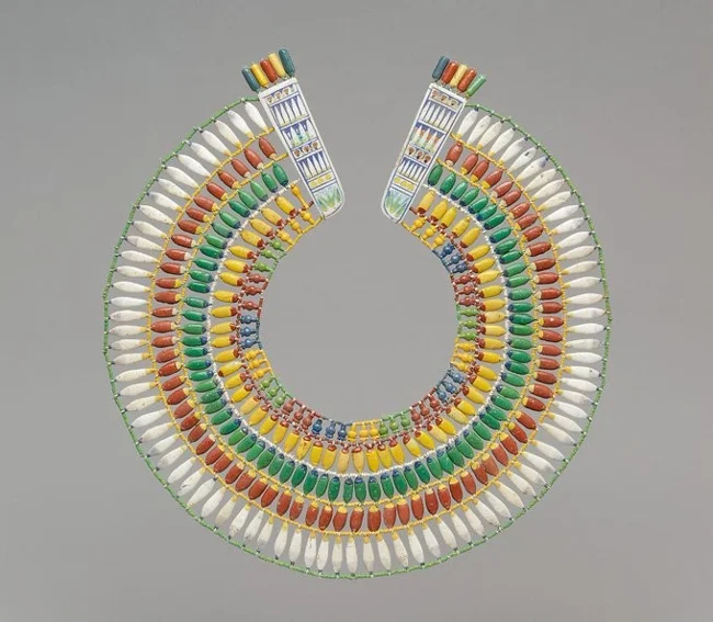 Аксессуар был изготовлен в Египте около 1353-1336 гг. до н.э. Он сделан из бусин из фаянса и украшен яркими рядами из лепестков лотоса, фиников и васильков. Такой воротник не только подчёркивал красоту, но и часто использовался для обрядов и ритуалов, символизируя плодородие и защиту.