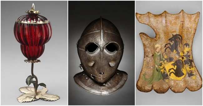 Германский щит 1470 года с изображением Святого Христофора, который, как считалось, защищал от внезапной смерти. Это изображение было особенно значимо, так как щит использовался либо на поле боя, либо в турнирах, где угроза была велика, и защита считалась крайне необходимой. Почти как иконы на машинах сейчас. Вот откуда пошёл этот символизм!
