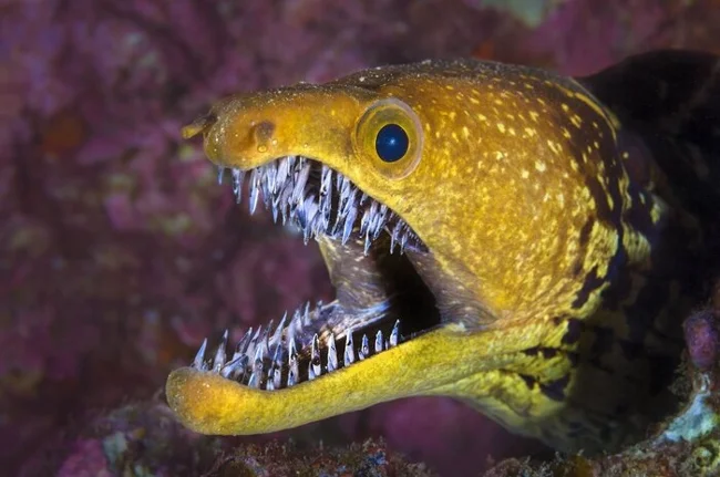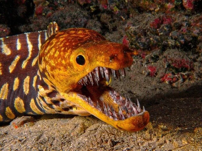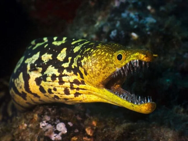 Всего в мире насчитывается более 100 видов мурен и большинство из них очень агрессивные, но одной из самых агрессивных считается Саблезубая мурена.