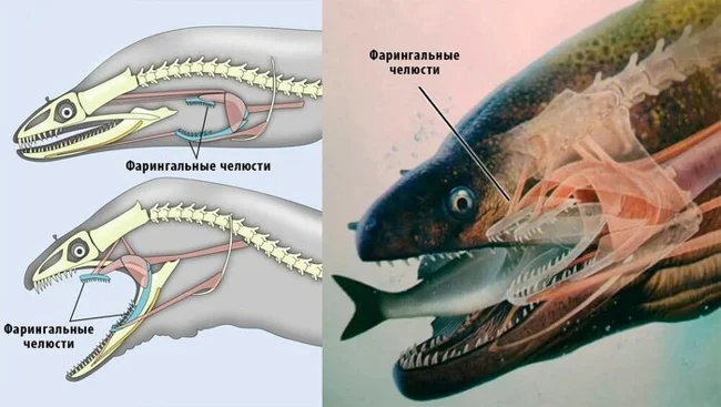 Как и другие мурены, саблезубая мурена имеет внутреннюю челюсть как у ксеноморфа из фильма Чужой. Схватив добычу, голодный хищник проталкивает свою еду в пищевод с помощью фарингальной челюсти.