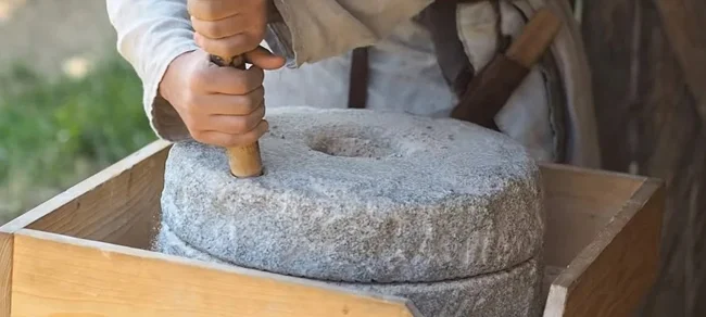 Жернова применяли в хозяйстве с глубокой древности. Поверхность обоих жерновов покрыта особым рельефным «рисунком» – так называемой гармошкой. Он представляет собой чередование желобов, мелких борозд и плоских участков. Зернышки, попадая в противоположные борозды двух каменных блоков, переламываются на более мелкие частицы. Благодаря этому обеспечивается процесс перемалывания зерна. Идеальным материалом для производства жерновов считалась особая разновидность мелкозернистого песчаника, отличающаяся повышенной твердостью и прочностью.
