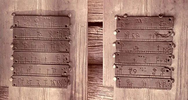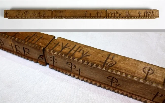 Это деревянный резной календарь, который мог состоять из одной палки или из нескольких дощечек