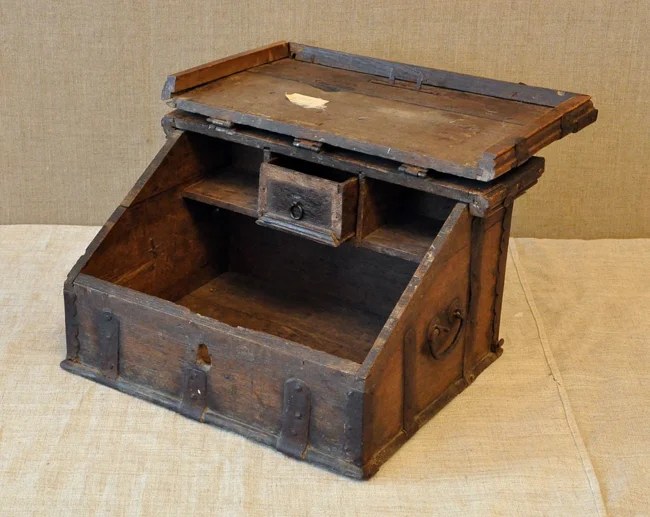 Это сундук-подголовник. Предмет для хранения и перевозки ценностей, своего рода дорожный сейф