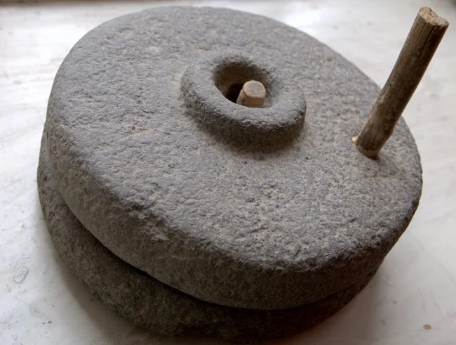 Это жернова. Мельницы, в которых использовали жернова, бывали ручными или в качестве движущей силы использовали животных, или механические двигатели