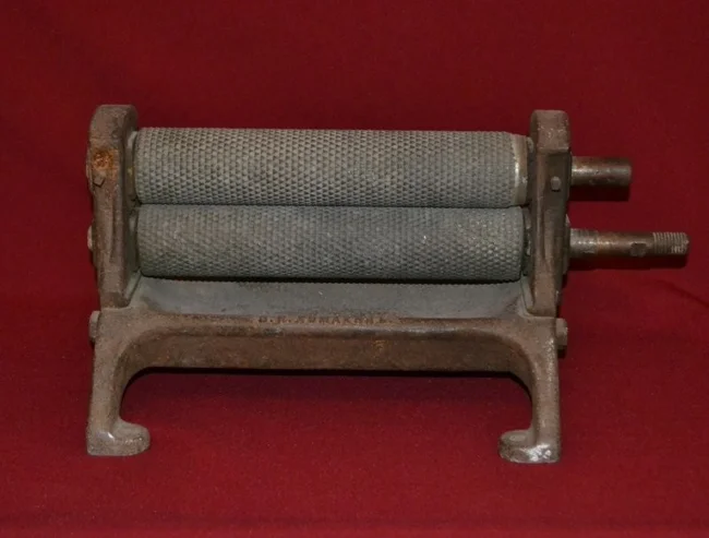Это предмет предназначен для пчеловодства, его называли - вальцы для изготовления вощины. Вощи́на — это искусственная основа для постройки пчелиных сот, представляющая собой тонкий прямоугольный лист из воска с выдавленными донышками ячеек. Вощина помогала пчёлам строить соты, что вело к более быстрому развитию пчелиной семьи, и позволяло увеличить добычу мёда. Вальцы изобрёл и изготовил в своей мастерской, расположенной в Курской области, изобретатель Ломакин Владимир Иванович в 1887 году. Впоследствии он наладил массовое производство вальцов, что позволило отказаться от импорта.