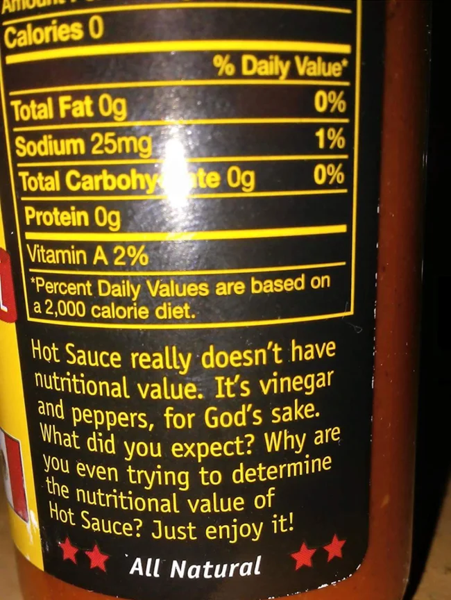 Калории: 0 Всего жиров: 0 г Натрий: 25 мг Всего углеводов: 0 г Протеин: 0 г У острого соуса нет пищевой ценности. Тут один уксус и перцы, черт возьми. А вы чего хотели? Зачем вы вообще пытаетесь определить пищевую ценность острого соуса? Просто наслаждайтесь!