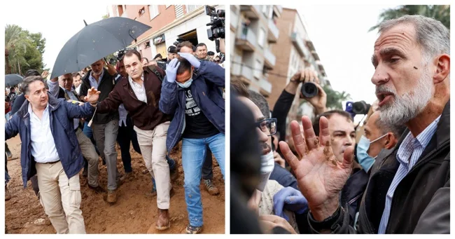 «Убирайтесь, убийцы!»: короля Испании и его приближённых забросали грязью во время визита в пострадавшую от страшного наводнения Валенсию (1 фото + 6 видео)